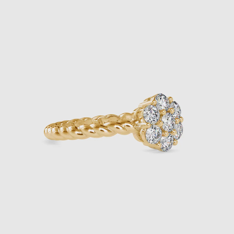 Expertly handcrafted by skilled artisans, each lab-grown diamond is carefully set to ensure balance, symmetry, and lasting shine. The twisted gold band brings depth and character to the design, while the cluster arrangement reflects light beautifully from every angle. Designed for comfort and everyday wear, this ring offers elegance without compromise.