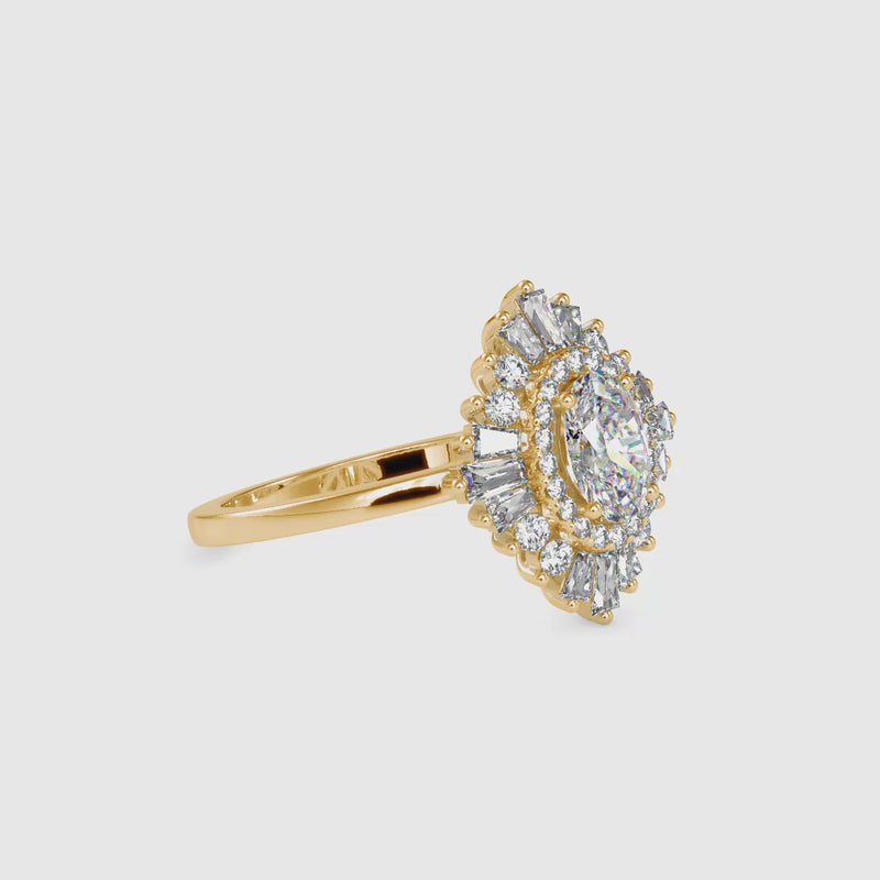 The halo setting amplifies the size and shine of the center stone, allowing light to reflect beautifully from every angle. Set on a polished gold band, this ring offers a refined finish and a comfortable fit, making it perfect for engagements, anniversaries, or meaningful celebrations.